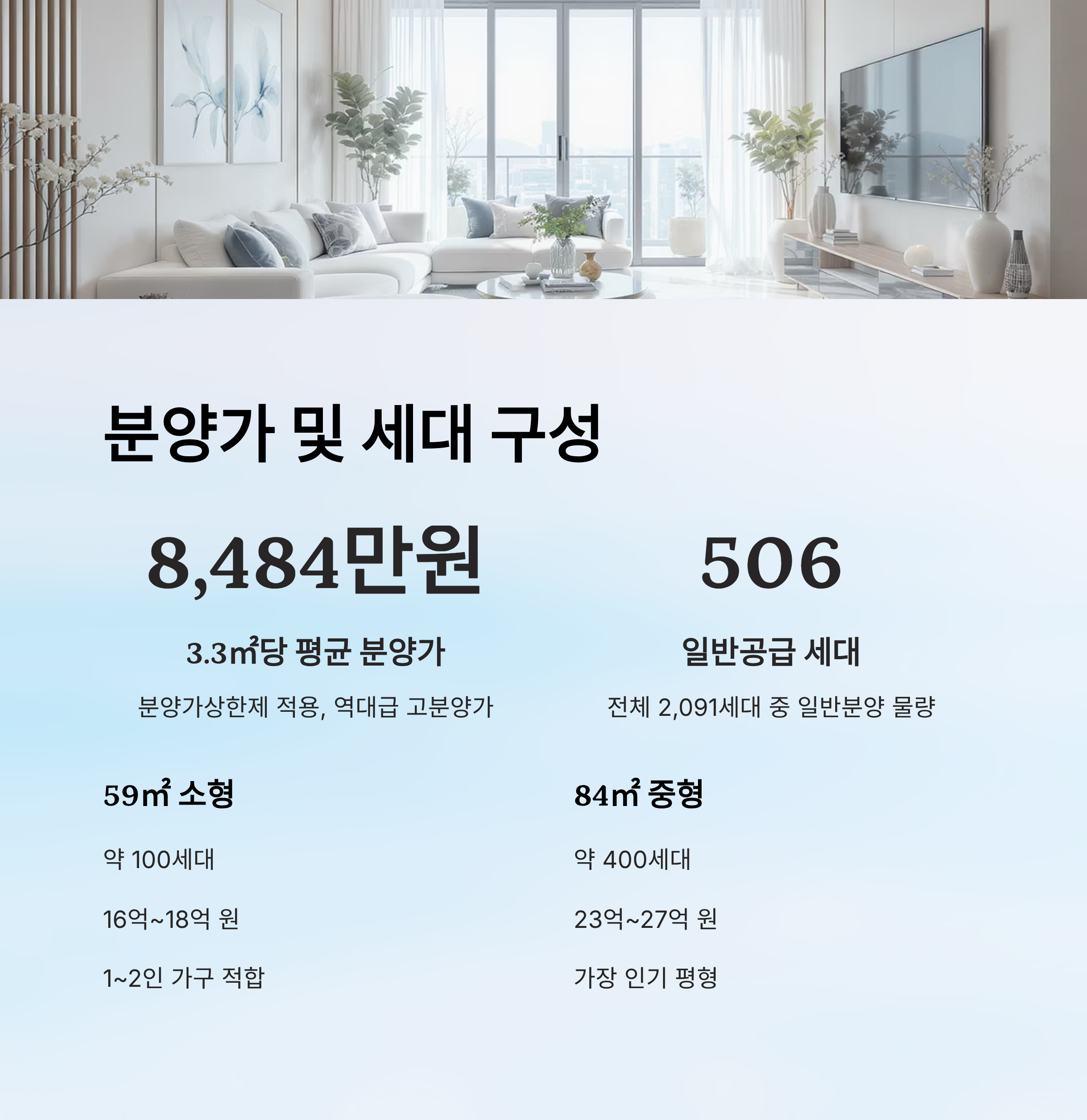 분양 세대는 총 2,091세대 중 일반공급은 506세대로 구성돼 있어요. 그 외는 조합원 물량이에요. 일반 분양 물량의 대부분은 전용면적 59㎡, 84㎡로 중소형 타입에 집중돼 있어요. 실거주 수요를 겨냥한 구성이라고 볼 수 있죠.