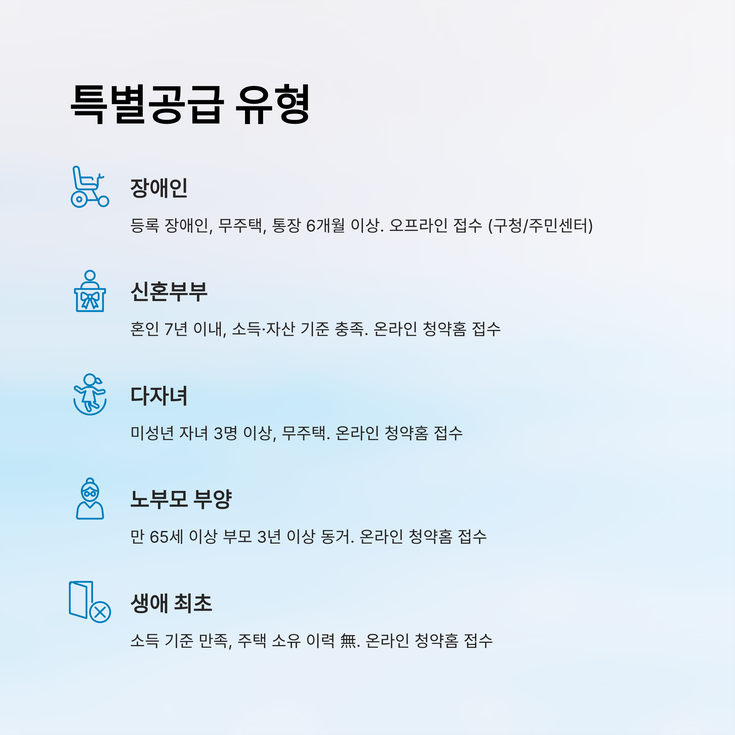특별공급을 노리는 분들은 별도의 요건이 적용되기 때문에 다음 섹션에서 자세히 소개할게요. 장애인, 다자녀, 신혼부부 등 각 유형에 따라 서류와 심사 방식도 달라요.
