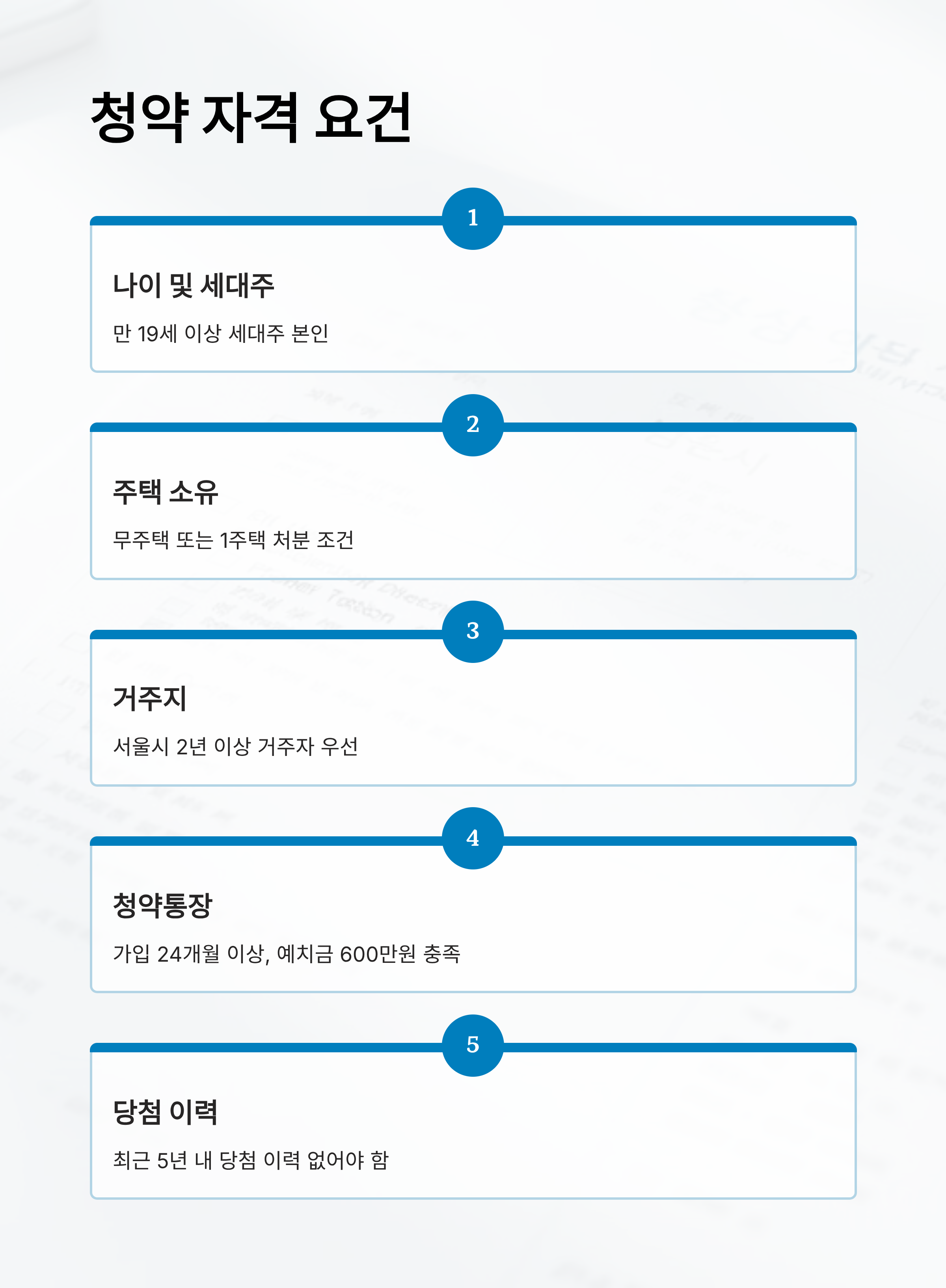 또한 최근 5년 내에 다른 민영주택이나 국민주택 당첨 이력이 없어야 해요. 이 요건은 재당첨 제한 규정과도 연결되는데, 만약 과거에 당첨 이력이 있다면 청약 자격 자체가 제한될 수 있어요. 사전에 청약홈에서 본인의 당첨 이력을 조회해보는 게 안전해요.
