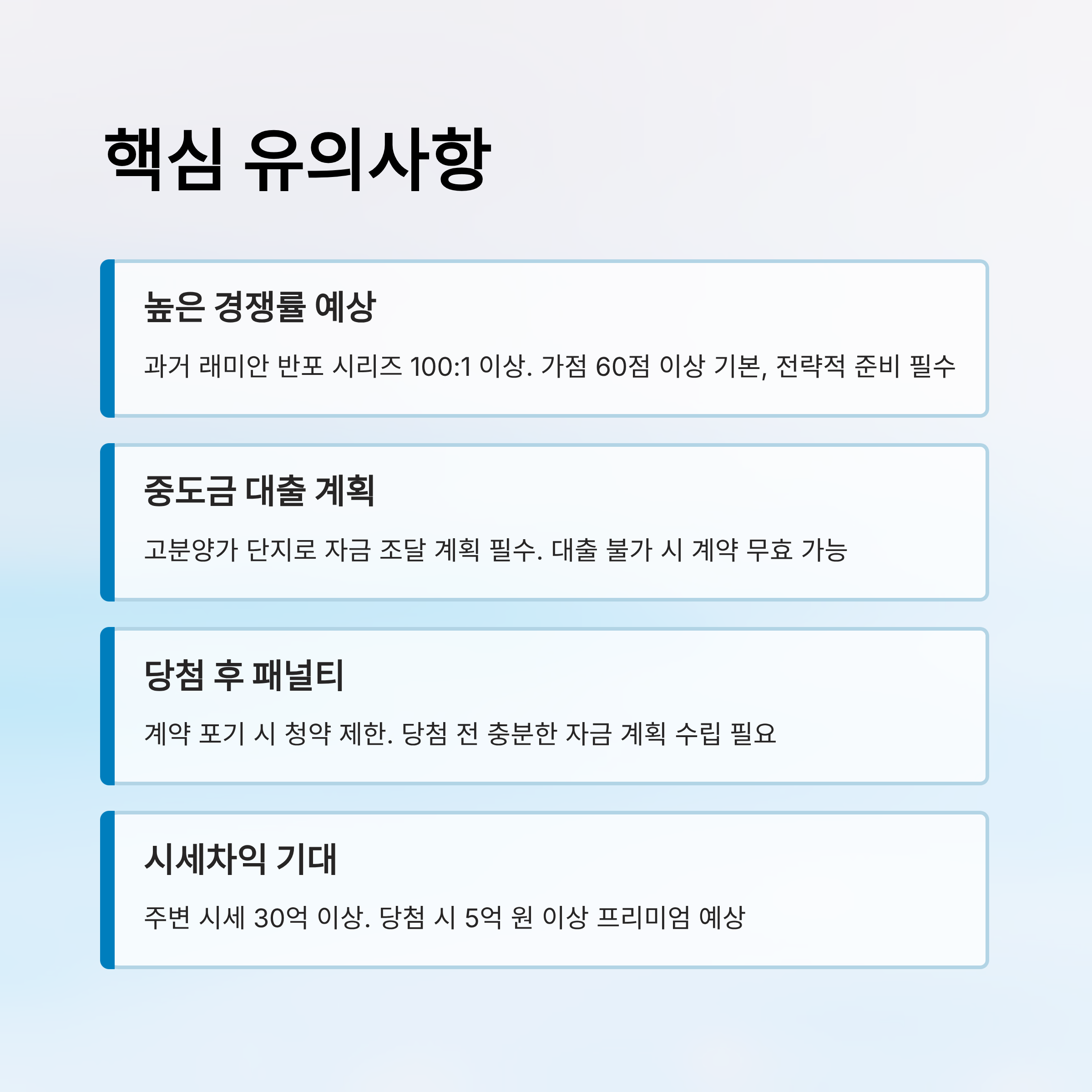 분양가가 부담되는 분들은 중도금 대출이나 자금 조달계획도 함께 준비해두는 게 필수예요. 고분양가 단지의 경우 자금 계획이 승인되지 않으면 계약이 무효 처리되거나 해약될 수 있어요.