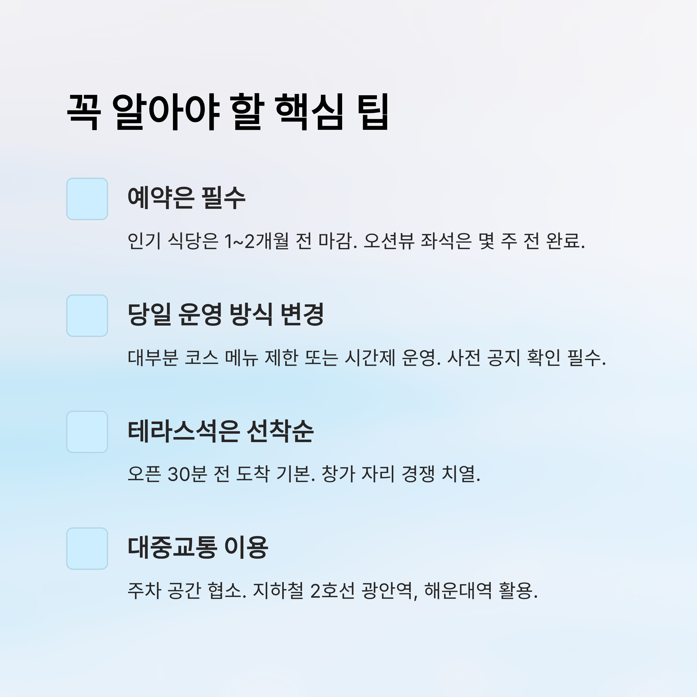 광안리 지역에서는 테라스석이나 창가 좌석이 금세 예약 마감되기 때문에, 방문을 원한다면 최소 1개월 전에는 예약하는 것이 좋아요. 여기어때, 네이버예약 등을 활용하면 실시간 좌석 현황도 확인할 수 있어요.