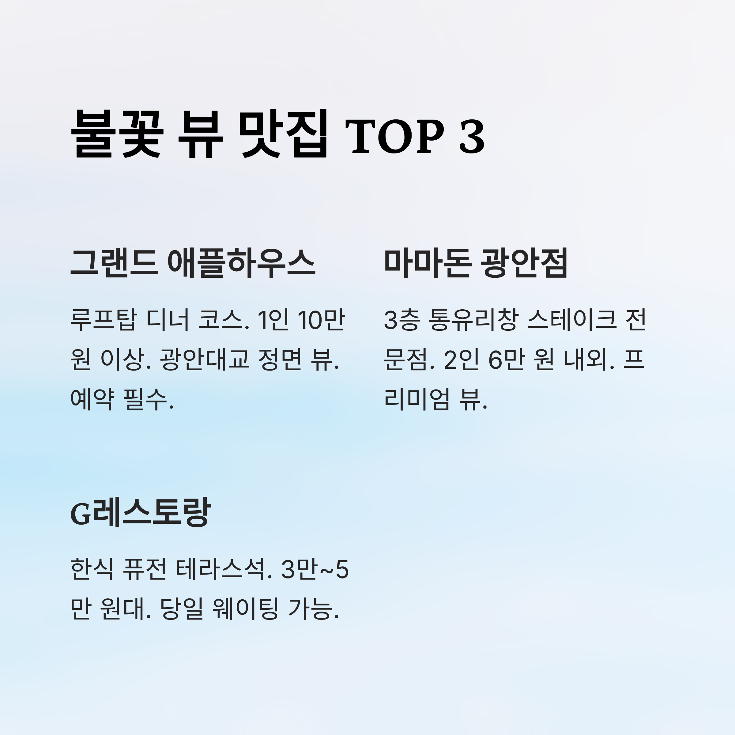 | G레스토랑 | 한식 퓨전 | ✅ 테라스 | ₩30,000~₩50,000 | ❌ 당일 웨이팅 |