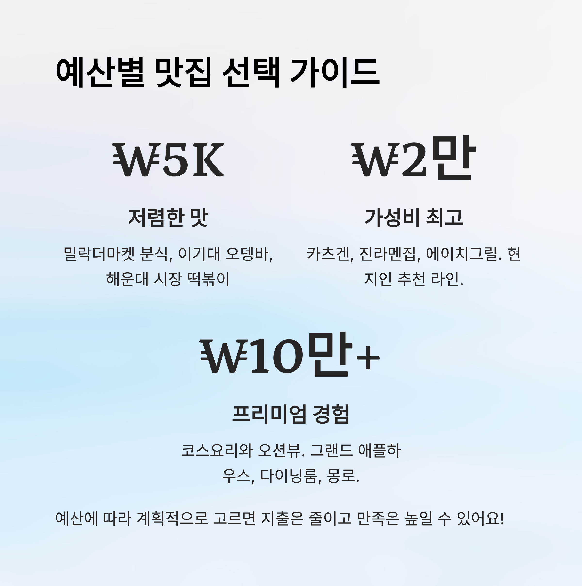 먼저 1인 1만 원 이하의 저렴한 맛집들은 밀락더마켓 안 분식 코너, 이기대 쪽 오뎅 바, 해운대 시장 내 백종원 떡볶이 가게 등이 있어요. 서서 먹거나 포장해서 바닷가에서 먹기 좋은 메뉴들이에요.
