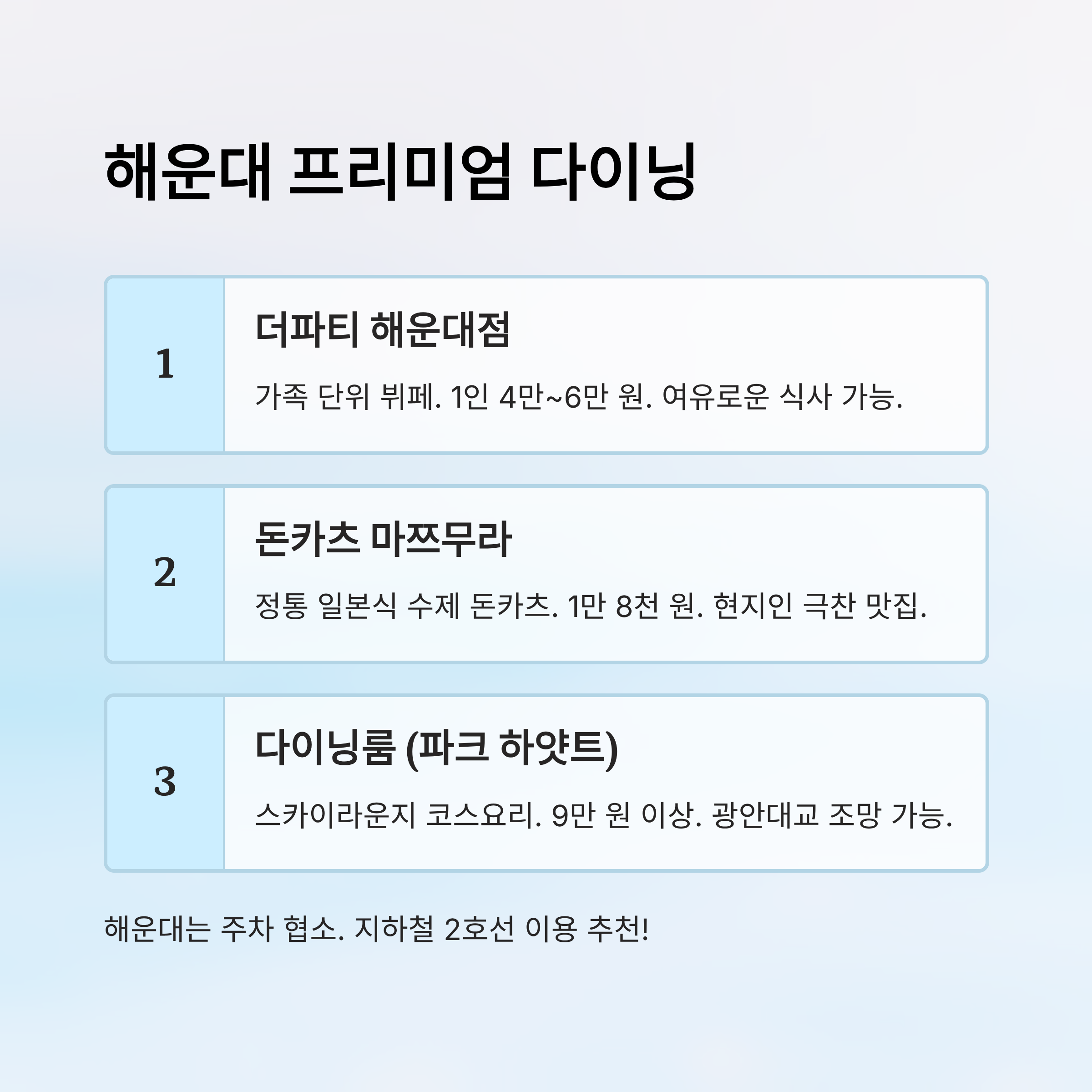 해운대 맛집의 대부분은 주차 공간이 협소하거나 유료인 경우가 많아서, 축제 날엔 대중교통을 이용하는 걸 추천해요. 지하철 2호선 해운대역과 중동역 주변엔 가성비 좋은 맛집도 많답니다! 🍣🚆