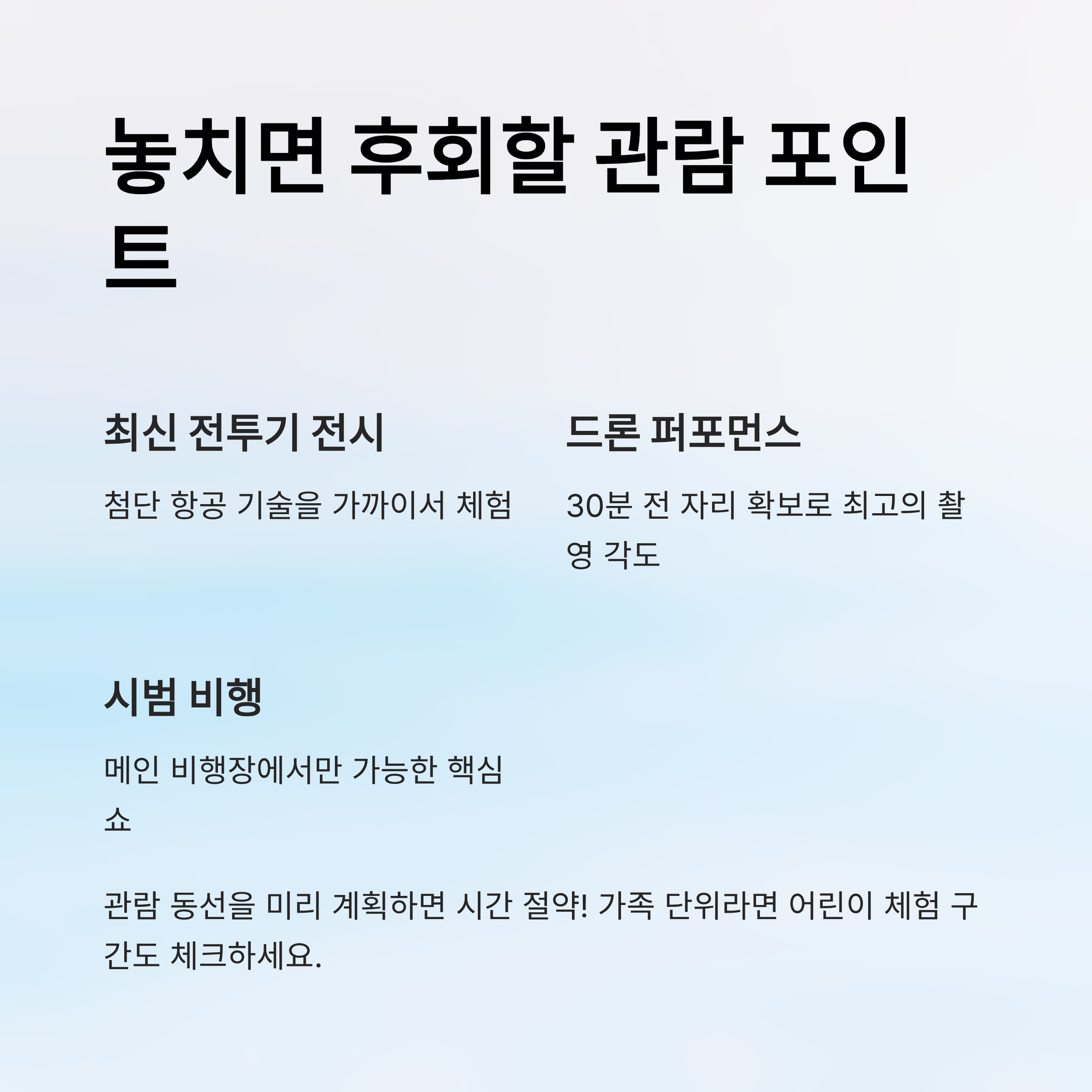 🌟관람 포인트는 놓치면 후회할 핵심 장소를 의미해요. 최신 전투기, 드론 시연장, 항공 기술 체험존 등 다양한 볼거리가 있어요. 관람 동선을 미리 계획하면 시간을 절약할 수 있답니다.