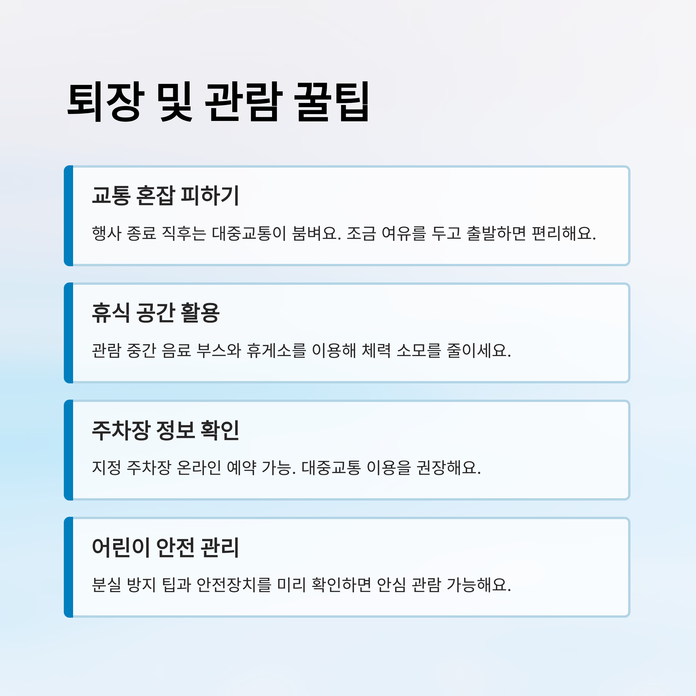 📝관람 후 퇴장 시에는 교통 혼잡을 피할 수 있는 시간대를 고려하면 좋아요. 행사 종료 직후는 대중교통이 붐비므로, 조금 여유를 두고 출발하는 것을 추천해요. 주변 주차장 정보도 미리 확인해두면 편리해요.