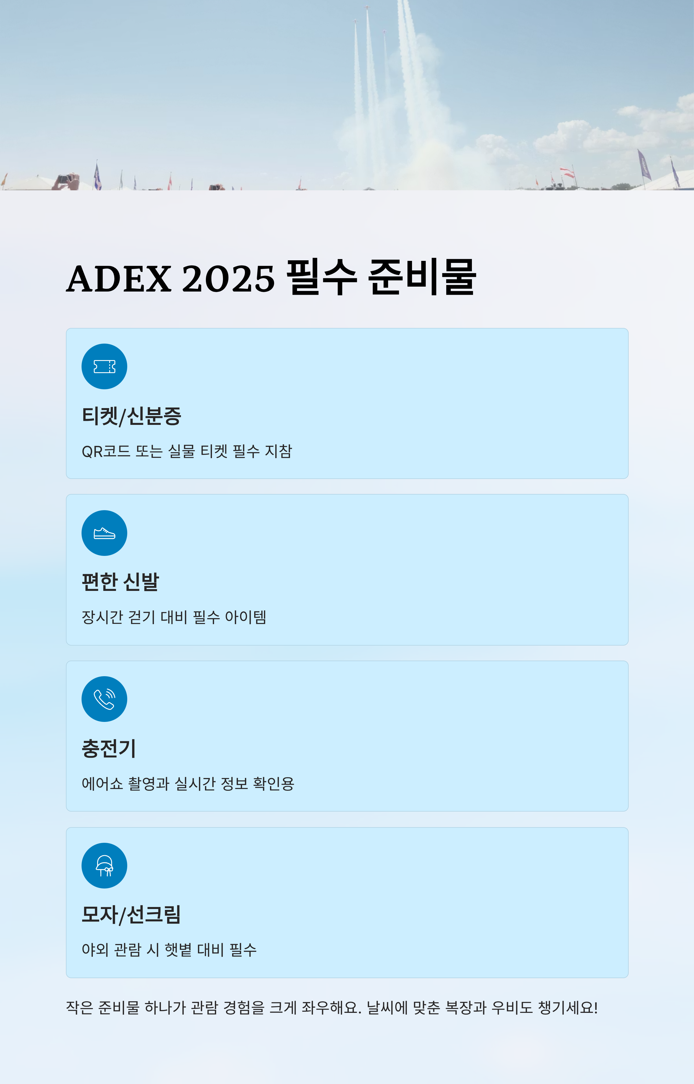 🍀성남 ADEX 2025는 최신 항공기, 드론, 우주 기술까지 한 자리에서 만날 수 있는 행사예요. 입장 전 반드시 챙겨야 하는 준비물 리스트를 확인해요. 티켓, 신분증, 편한 신발, 그리고 스마트폰 충전기까지 필수랍니다.