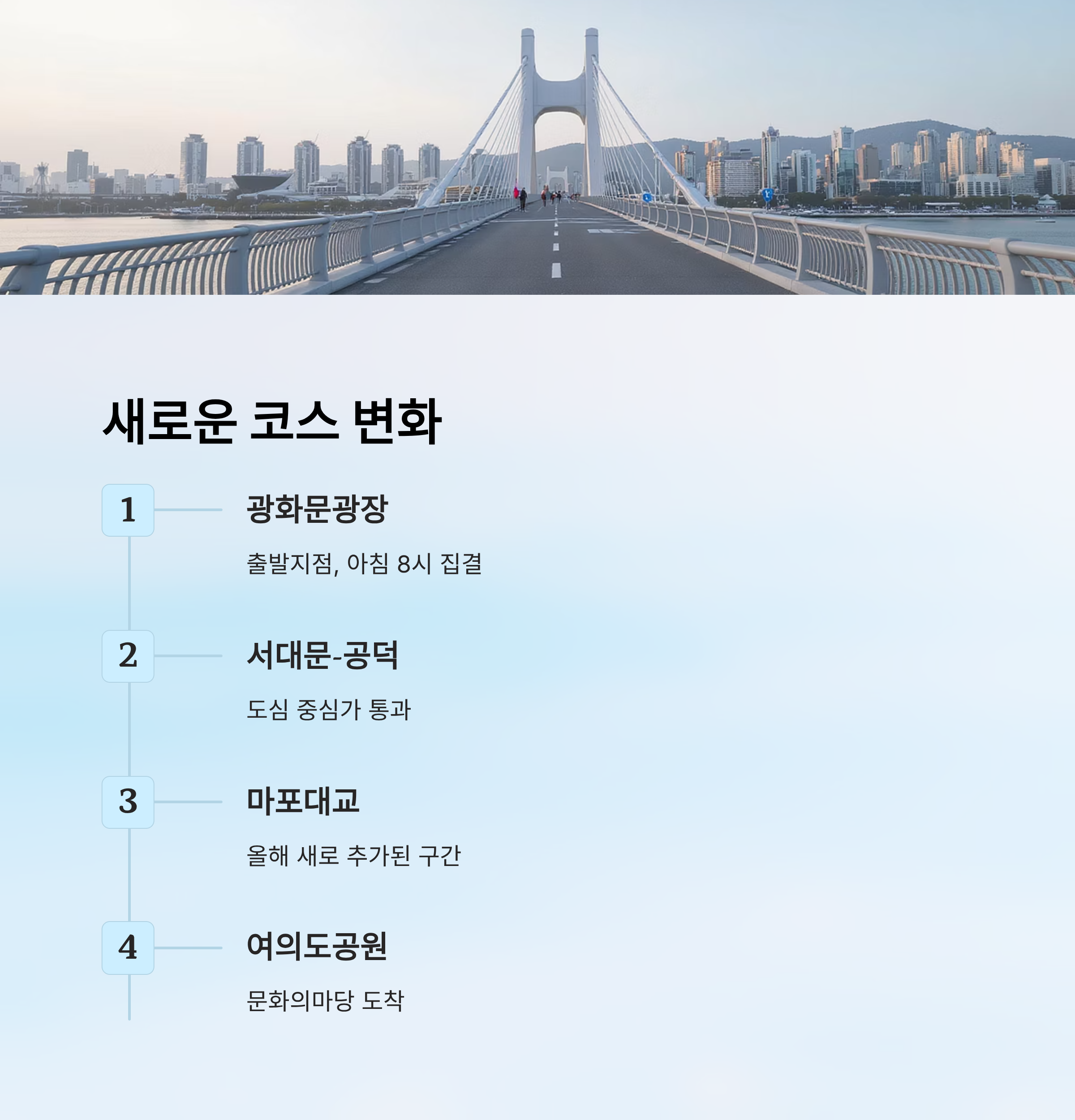 경로는 광화문광장에서 시작해 서대문, 충정로, 공덕, 마포대교를 건너 여의도공원 문화의마당까지 이어지는데요. 서울 중심부를 가로지르는 이 코스는 유모차 이동이 가능한 평탄한 길로 구성돼 있어 안전성도 확보됐어요.