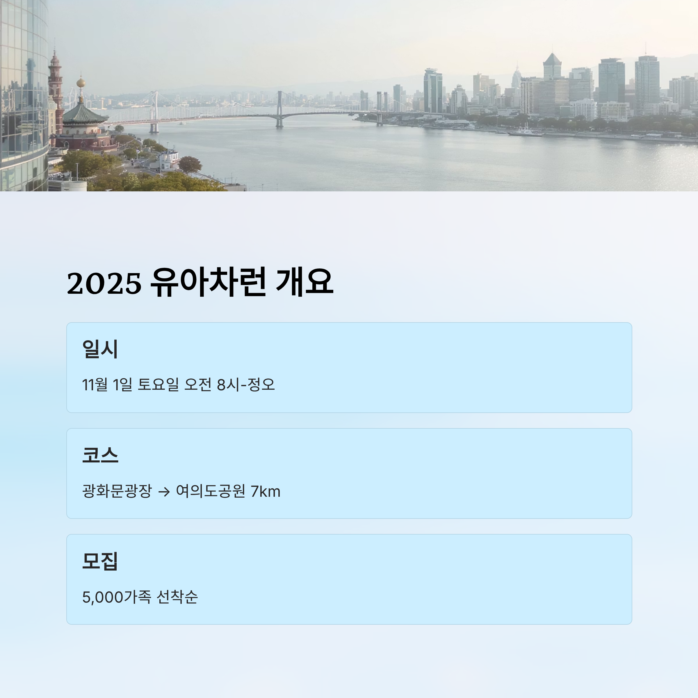2025 유아차런의 가장 흥미로운 변화 중 하나는 바로 '코스의 확장'이에요. 작년에는 광화문에서 여의도까지 약 6km였는데, 올해는 7km로 늘어나 조금 더 도심의 풍경을 깊이 있게 즐길 수 있도록 조정됐어요. 걷기에 딱 좋은 가을 아침이니 부담 없는 거리죠!