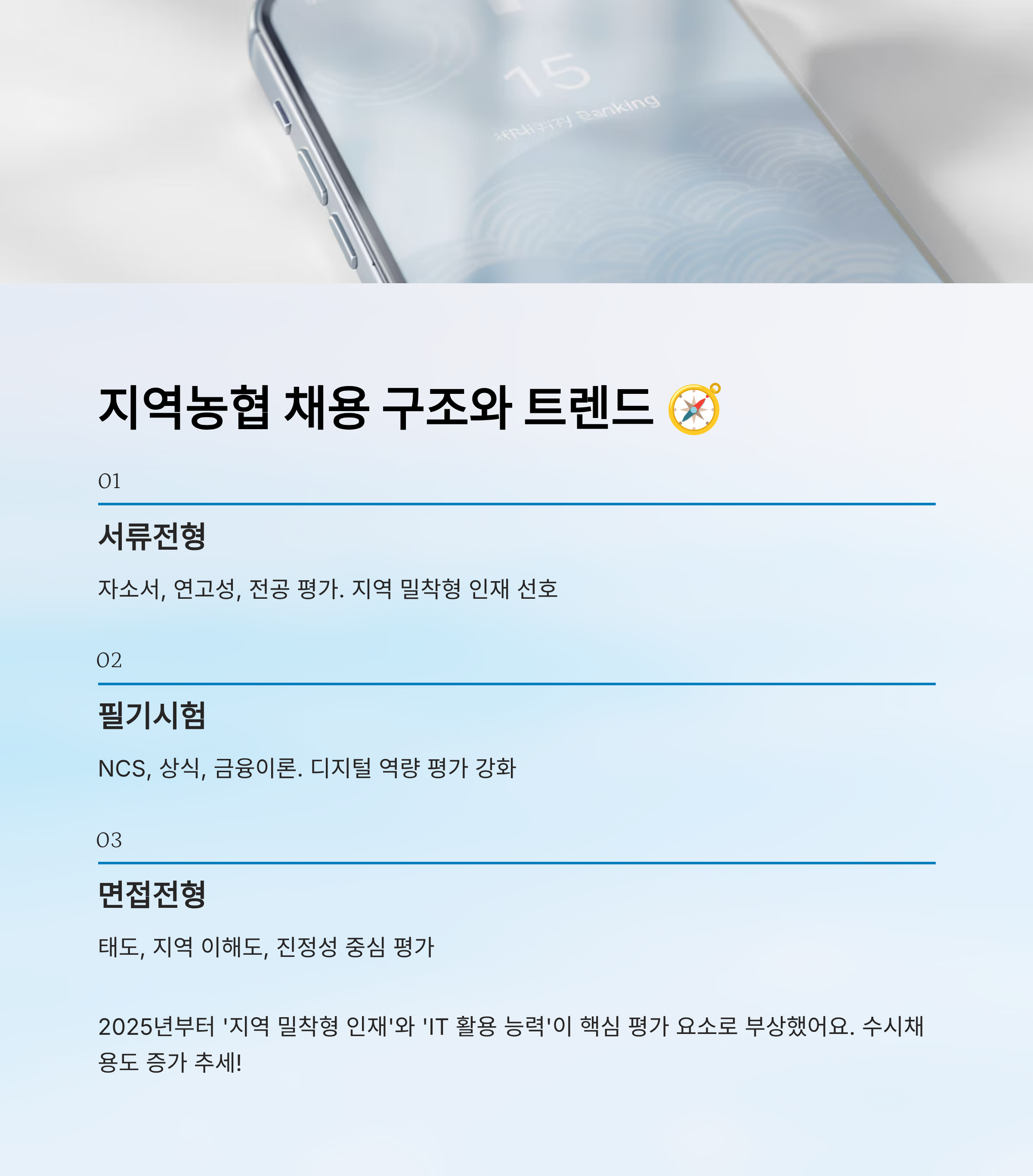 📌 본 콘텐츠는 현직자 인터뷰, 지역농협 채용 공고, 지원 후기 등을 기반으로 작성된 정보성 콘텐츠입니다. 실제 채용 기준은 지역 농협 및 시기별로 달라질 수 있으며, 공식 채용 공고 확인이 가장 정확합니다.