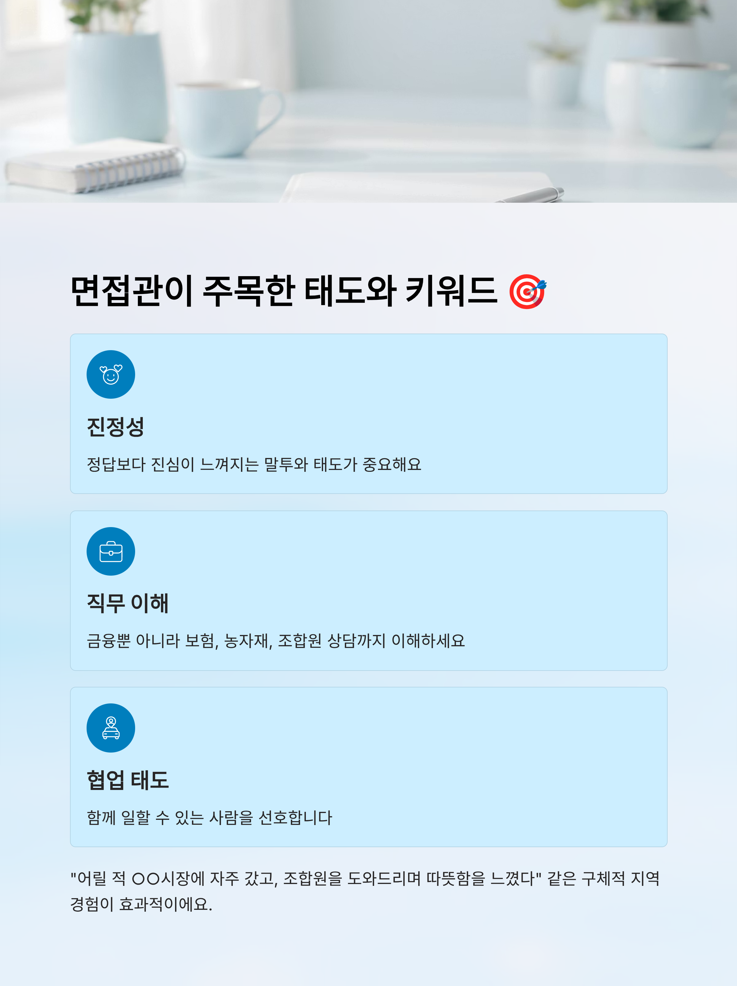 두 번째로 중요한 건 ‘현실적인 직무 이해’예요. 지역농협의 업무는 단순 금융을 넘어, 보험·농자재·조합원 상담까지 다양해요. 그걸 모르고 “은행처럼 근무하고 싶다”는 말만 하면 준비 부족으로 보일 수 있어요. 현직자들은 실제로 “저는 고령 조합원분들의 방문을 도우며 일하고 싶어요” 같은 말에 높은 점수를 줬다고 해요.