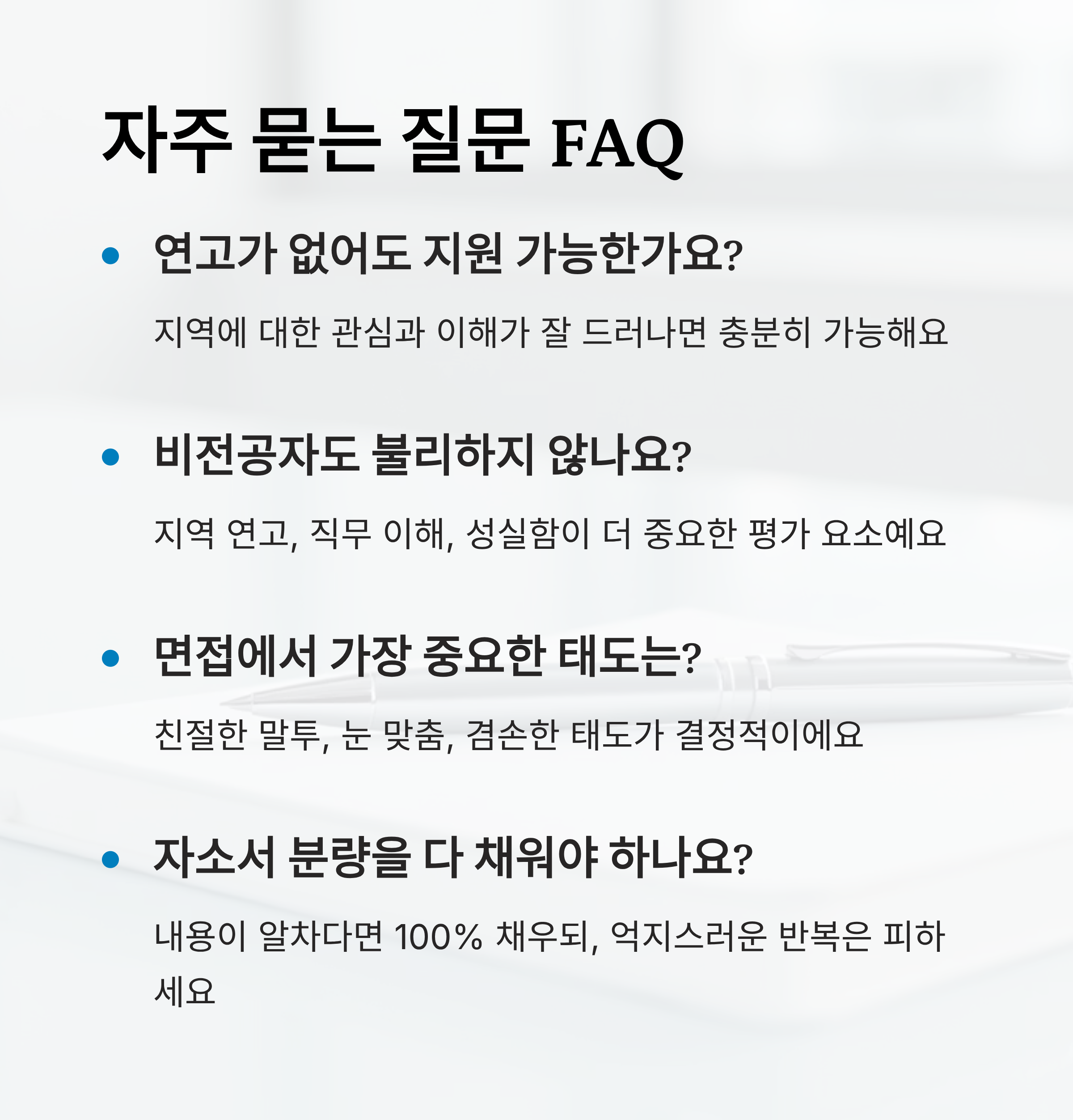 | 면접 | 태도, 지역 이해도 | 지역밀착형 답변 필요 |