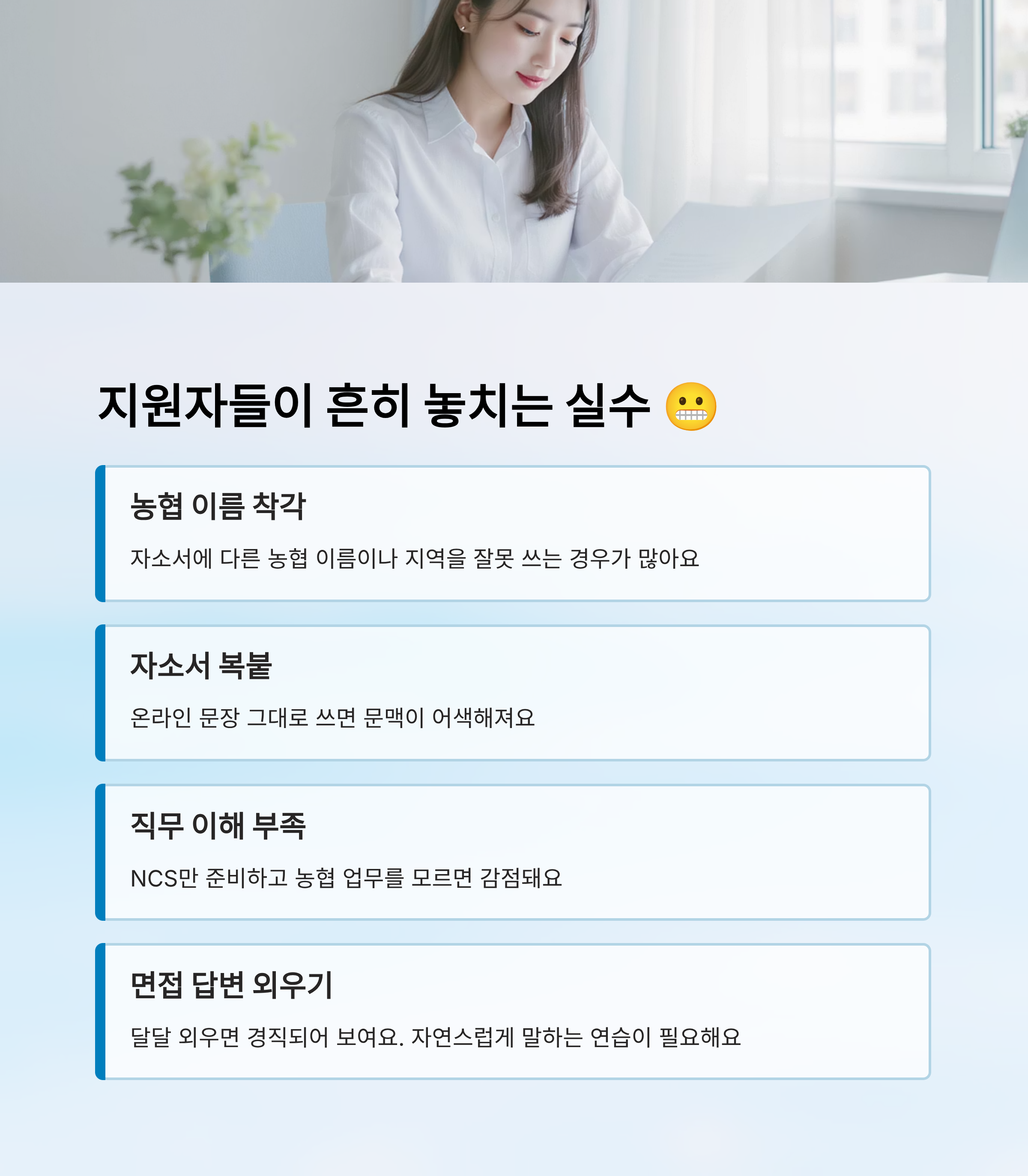 지원 전엔 꼭 ‘내가 가고 싶은 농협은 어떤 스타일일까?’를 한 번 더 체크해보세요. 이제 다음 파트에서는, 많은 지원자들이 간과하는 실수들을 모아 알려드릴게요! 😬 이것만 피해도 합격률이 확 올라가요!