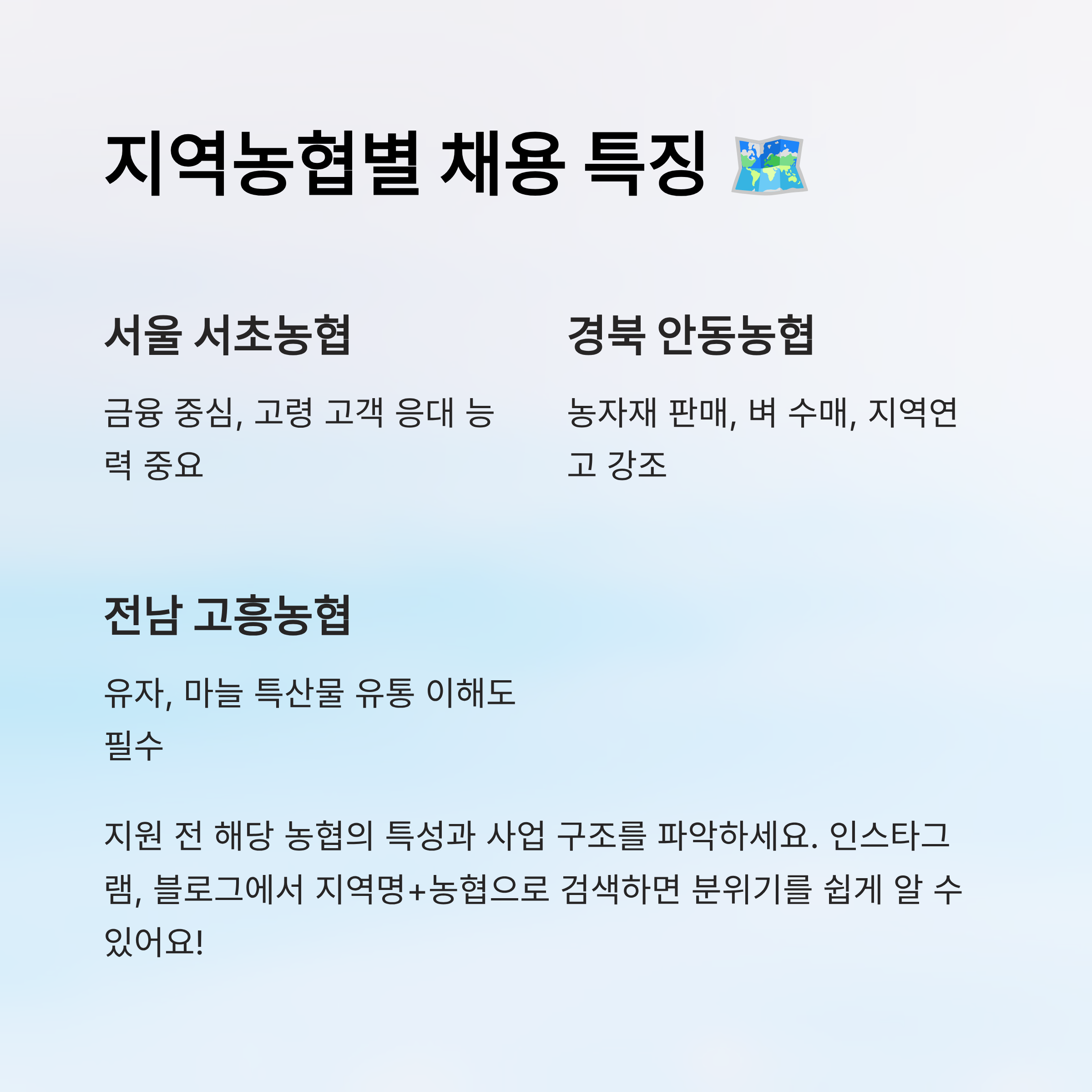 면접에서 중요한 건 유창한 말보다, 내가 왜 이 일을 하고 싶은지 스스로 납득할 수 있어야 해요. 다음 파트에서는 지역농협마다 조금씩 다른 채용 특징과 사례들을 정리해볼게요. 실제 지점별 스타일 차이도 참고하면 큰 도움이 될 거예요! 🗺️